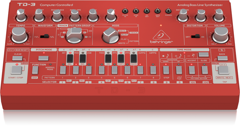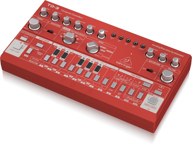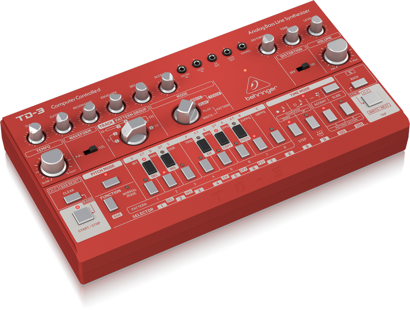 303といえばあのシルバーに輝くメタリックなボディが特徴ですよね。TD-3 はカラフルに全3色展開で、オリジナルに近いシルバーの「TD-3-SR」、超目立つ真っ赤な「TD-3-RD」、落ち着いた青い「TD-3-BU」があります。他の機材の色とのコーディネートでお好きな色が選べます。