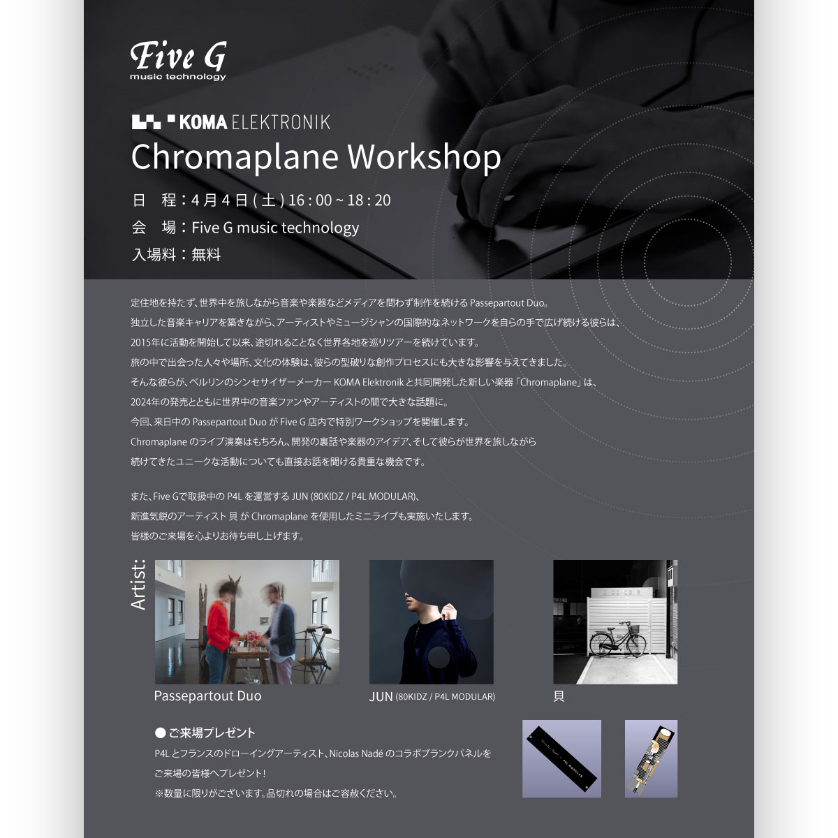 ホームReviewsChromaplane ワークショップ&ライブ開催! Chromaplane ワークショップ&ライブ開催!event、Reviews / By fiveg_staff / 2026年3月21日 2026年3月21日 Chromaplane ワークショップ&ライブ 日 程:4月4日(土) 16:00~18:20 会 場:Five G music Technology 入場料:無料 イベント概要 定住地を持たず、世界中を旅しながら音楽や楽器などメディアを問わず制作を続ける Passepartout Duo。独立した音楽キャリアを築きながら、アーティストやミュージシャンの国際的なネットワークを自らの手で広げ続ける彼らは、2015年に活動を開始して以来、途切れることなく世界各地を巡りツアーを続けています。旅の中で出会った人々や場所、文化の体験は、彼らの型破りな創作プロセスにも大きな影響を与えてきました。そんな彼らが、ベルリンのシンセサイザーメーカー KOMA Elektronik と共同開発した新しい楽器「Chromaplane」は、2024年の発売とともに世界中の音楽ファンやアーティストの間で大きな話題に。今回、来日中の Passepartout Duo が Five G 店内で特別ワークショップを開催します。Chromaplane のライブ演奏はもちろん、開発の裏話や楽器のアイデア、そして彼らが世界を旅しながら続けてきたユニークな活動についても直接お話を聞ける貴重な機会です。また、Five G で取扱中の P4L を運営する JUN (80KIDZ / P4L MODULAR)、新進気鋭のアーティスト 貝 が Chromaplane を使用したミニライブを実施!P4L からはご来場の皆様へのプレゼントとして、フランスのドローイングアーティスト Nicolas Nadé とのコラボブランクパネルをご用意いただきました。※数量に限りがございます。品切れの場合はご容赦ください。皆様のご来場を心よりお待ち申し上げます。 ワークショップPassepartout DuoライブPassepartout DuoJUN (80KIDZ / P4L MODULAR)貝 KOMA Elektronik - Chromaplane2つのコイルを本体の表面上で動かすことで、本体から発生する多層的な電磁信号を「聴く」ようにして演奏するエレクトロ・マグネティック・シンセサイザー 出演アーティスト Passepartout Duo Passepartout Duo は、自作の電子楽器とエレクトロ・アコースティックな手法を軸に、「音との関係」そのものを問い、そして実践する音楽ユニットです。2015年以降ほぼ継続的に世界を巡り、その経験を制作に反映しています。電磁気やテキスタイルなど独自素材を用いた作品群を発表し、楽器開発にも力を注いでいます。自作楽器「Chromaplane」は製品化され、国際的な楽器コンペで受賞。多数のレジデンスや美術館・ビエンナーレにも参加するなど、音楽と美術を横断する活動を展開しています。インタビューhttps://kiac.jp/article/3790/ https://www.musictribunetokyo.com/2024/11/interviewpassepartout-duo.html JUN (80KIDZ / P4L MODULAR) 07年より80KIDZのメンバーとして活動を開始。以後コンスタントに作品をリリースしている。 ダンスミュージックに重点を置いたモジュラーシンセ・コレクティブ「Patching for life」のメンバーとしても活動。2020年には自身のブランド『P4L MODULAR』を設立し設計/デザイン、製作の全てを行っている。 近年は西海岸シンセシスのテイストを取り入れることや生楽器と電子楽器を組み合わせることにも挑戦している。 貝 ご来場プレゼント P4L とフランスのドローイングアーティスト、Nicolas Nadé のコラボブランクパネルを ご来場の皆様へプレゼント!※数量に限りがございます。品切れの場合はご容赦ください。 ※注意事項 当店は楽器店であり、ライブ視聴を目的とした施設ではありません。イベント開催中も通常通りの店舗営業を行います。店内滞在中は皆様譲り合いのご協力をお願いいたします。店舗外のエントランスや階段での滞在、また声を出して話すなど、他のテナントへ迷惑をかけるような行為はご遠慮ください。ご来場の人数や状況により入場を制限する場合がございます。